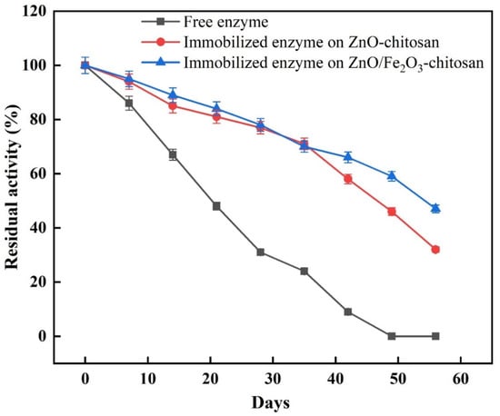 To determine storage stability, the activities of free and immobilized enzymes were determined after two months of storage at 4 °C. The activity was determined every 7 days. The immobilization process improved the enzyme’s storage stability (Figure 4). The results showing that the immobilized enzyme onto CS/ZnO and CS/ZnO/Fe2O3 exhibited 46% and 59% of its original activity, respectively, after 7 weeks of storage, whereas the free enzyme, over the same period, lost its activity. Therefore, immobilization significantly reduces enzyme deactivation and enhances the enzyme stability. In several studies, immobilized catalase on copper-adsorbed chitosan beads lost about 50% of its activity after 60 days [22], but when using chitosan bentonite beads as a support for catalase, the enzyme retained about 60% of its activity after 60 days [34].
