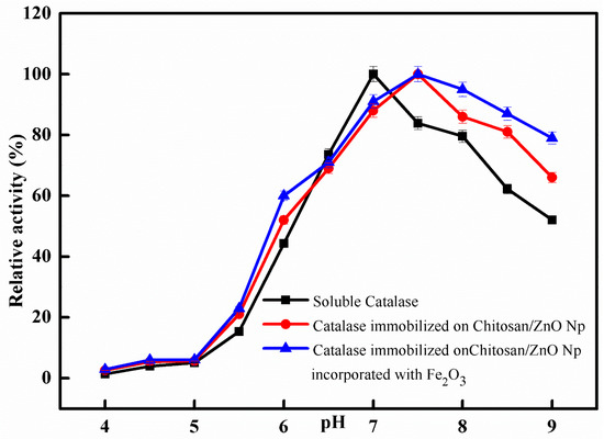 The impact of pH on the catalytic activity of free and immobilized catalase was comparatively studied at different pH values from 4.0 to 9.0. The obtained results are depicted in the graph shown in Figure 5; the optimum pH for free catalase activity was identified at pH 7.0, while it was shifted to pH 7.5 after immobilization. The activity of immobilized catalase on CS/ZnO/Fe2O3 was greater than that of immobilized catalase on CS/ZnO and free catalase at a series of pH scales (4.0–9.0), according to the results of both free and immobilized catalase. The optimum activity exhibited by free catalase and immobilized on chitosan bentonite was recorded at pH 7.5 and 8.0, respectively [34]. For comparison, the optimum activity exhibited by free catalase and immobilized on Eupergit C was recorded at pH 7.5 and 7.0, respectively [22]. The supporting secondary interactions between the immobilized enzyme on nanoparticles and the chitosan matrix are believed to be responsible for the pH shift towards alkaline values after immobilization [35,36].