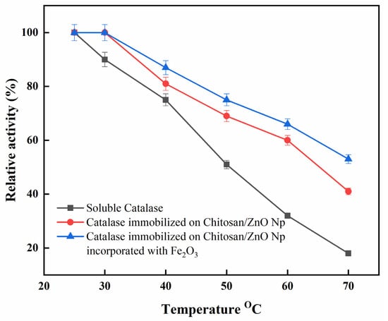 Figure 6 shows the influence of temperature on the activities of immobilized and free catalase. Data were standardized with respect to the highest activity exhibited by free and immobilized catalase in ideal conditions to better compare the behavior of catalase in different temperature conditions. The optimum relative activity of free catalase was recorded at 25 °C. However, immobilized catalase had a broad highest relative activity, approximately between 25 and 30 °C. The immobilized catalase on CS/ZnO/Fe2O3 also showed better thermal stability at 60 °C (~66%) and 70 °C (~53%) as compared to immobilized catalase on CS/ZnO [60 °C (~60%) and 70 °C (~41%)] and free catalase [60 °C (~32%) and 70 °C (~18%)]. Alptekin et al. demonstrated that the maximum catalytic activity for free catalase was recorded at 25 °C, whereas it shifted to 40 °C in the case of immobilized catalase onto Eupergit C [33]. In addition, at 40–70 °C, the activity of the immobilized catalase onto CS/ZnO/Fe2O3 was shown to be less temperature-sensitive than that of immobilized catalase onto CS/ZnO and free catalase. The temperature shift was caused by changes in the physical and chemical properties of the immobilized enzyme. Furthermore, the formation of the binding of immobilized catalases through amino groups might reduce conformational flexibility and lead to increased molecule activation energy to reorganize the proper conformation of substrate binding [37].