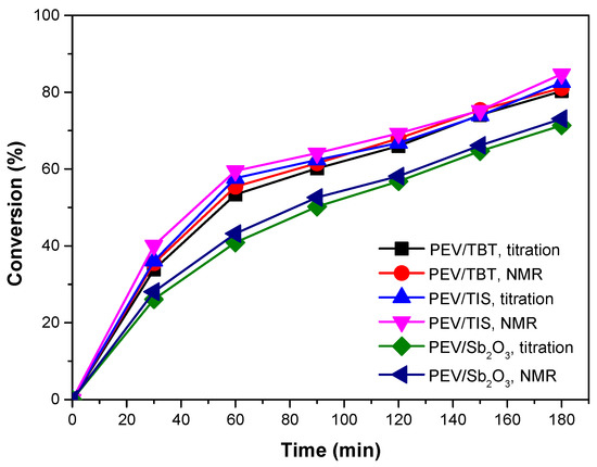 The assessment of the reaction progress during the esterification step, in the presence of each catalyst, is presented in Figure 3 and Table S1. As shown, the calculated conversion of -COOH groups using titanium-based catalysts ranged from 80% to 85%, while the use of Sb2O3 resulted in a 73% conversion. These results indicate that TBT and TIS demonstrate greater catalytic activity during the esterification stage of PEV, in accordance with its terephthalate and furan-2,5-dicarboxylate homologues [22,23,27,35].