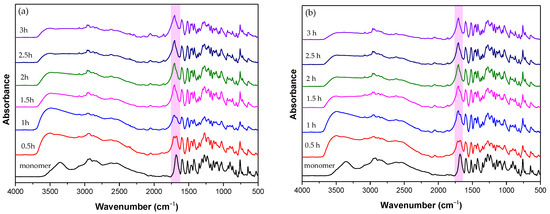 The FTIR spectrum of the monomer is displayed in Figure 4, as well as the spectra of the crude reacting mixture at different time intervals during the first stage of the reaction. Briefly, the monomer exhibited a broad absorption band at 3350–3500 cm−1, which can be attributed to the stretching vibrations of the hydroxyl group of the O-CH2-CH2-OH segment, two separate bands at 2600–3000 cm−1, linked to the stretching vibrations of the bound, through hydrogen bonds, carboxylic O-H groups, and a sharp, characteristic band at 1677 cm−1, owing to the C=O stretching vibration of the carboxylic acid [36]. Concerning the first 2 h of the esterification step, two absorption peaks were apparent in the carbonyl area of the spectrum, representing the acid and the ester bond (at 1684 and 1708 cm−1) stretching vibrations, respectively. As the reaction proceeded, the first peak diminished, and the formation of a unique peak at 1720 cm−1 was visible. Furthermore, the decrease of the absorption bands at 3350–3500 cm−1 and 2600–3000 cm−1 proved the successful esterification of the hydroxyl group and carboxylic acid. These observations are in agreement with the reaction progress determined by NMR and titrimetry.