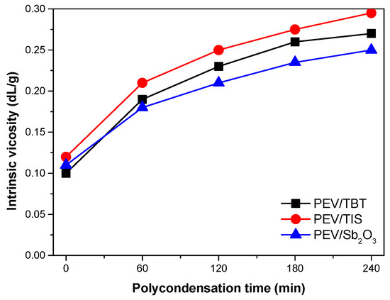 Except for the effect of the catalyst type on the esterification step, emphasis was also given to the evaluation of their activity on the polycondensation stage. The IV of the samples was measured in a phenol/1,1,2,2-tetrachloroethane mixture at 25 °C. As shown in Figure 5 and Figure S2, the samples exhibited different intrinsic viscosity values and subsequently various number average molecular weights, owing to the different reactivity of each catalyst. More specifically, PEV/TBT with [η] = 0.27 dL/g, PEV/TIS with [η] = 0.29 dL/g, and PEV/Sb2O3 with [η] = 0.25 dL/g were prepared. Similarly, the presence of a TIS catalyst resulted in a final polymer where Mn = 5014 g/mol, while TBT and Sb2O3 led to polyesters where Mn = 4375 g/mol and Mn = 3886 g/mol, respectively. It is evident that the use of titanium-based based catalysts provided higher IV values, and consequently final products with a higher molecular weight. Furthermore, as the reaction progressed, regardless of the catalyst type used, there was an obvious increase of both the IV and Mn values. Overall, the two-step melt polycondensation reaction was interrupted at preselected times to retrieve samples from the reacting mixture. Despite the brevity of each sampling, the interruptions may affect the final IV and Mn values of the produced polyesters.