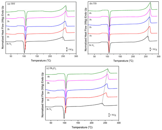 DSC thermograms of the condensation step at different reaction times in the presence of the (a) TBT, (b) TIS, and (c) Sb2O3 catalysts.