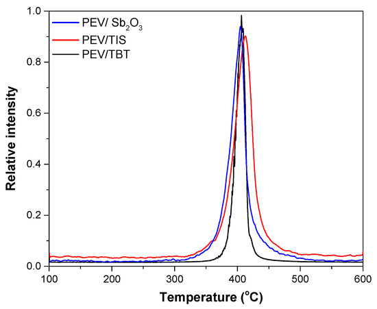 The thermal stability of the produced polyesters was evaluated using EGA/MS. As can be observed in Figure 7, the catalyst used appeared to have a small impact on the decomposition temperature peak of the final sample; however, not surprisingly, PEV synthesized with a titanium-based catalyst showed higher thermal stability [29], with a peak (corresponding to the temperature where the largest quantity of degradation products are produced) at 407 °C and 412 °C in the presence of TBT and TIS, respectively, while the Sb2O3-catalyzed material degraded at 405 °C. These observations support the hypothesis of the superior performance of these catalysts in the synthesis of PEV polyesters.