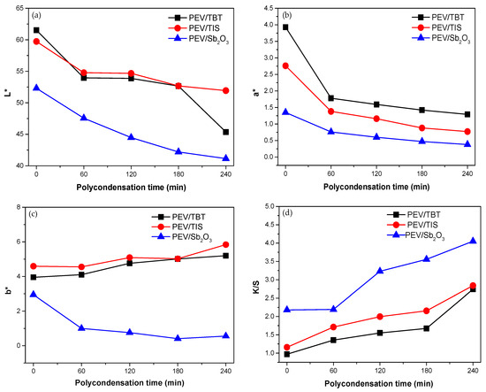 Variation of (a) L*, (b) a*, (c) b*, and (d) K/S values of PEV samples prepared with different catalysts and polycondensation times.