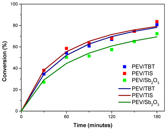 The values found for the single fitting parameter kCo are 0.018, 0.02, 0.0137 min−1 for the catalysts TBT, TIS, and Sb2O3, respectively. Considering that Co is the same for all catalysts, the esterification reaction constant appears to be largest for TIS, followed by TBT, leaving Sb2O3 as the least effective catalyst. The validity of the approximation of the system by Equation (3) is confirmed by assuming the reaction order exponent as a second fitting parameter. The fitting with two parameters led to values of the exponent very close to two.