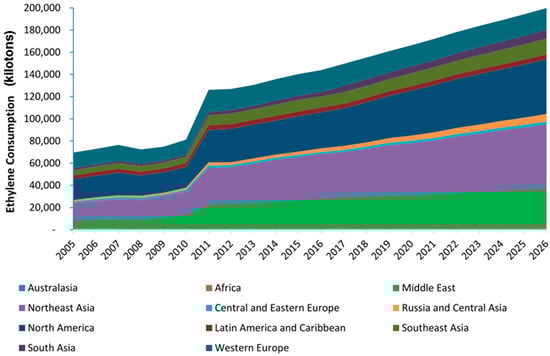 Ethylene is one of the most critical intermediates in the petrochemical industry and the global demand for this chemical is shown in Figure 1; it is currently produced through the steam cracking of light hydrocarbon derivatives, mainly ethane and naphtha [,,]. Ethylene complexes operate in 57 countries of the world. There are 215 ethylene producing facilities operating in the world. The operators of these complexes are about 100 companies, and the largest are ExxonMobil, SABIC, DowDuPont [,,]. The world’s largest concentration of ethylene production capacity is located in the four main regions of North America, Northeast Asia, Central Asia, and Western Europe. Moreover, the main production growth will be observed only in North America and Northeast Asia. The main reason for the growth in ethylene production in Northeast Asia is the demand for ethylene processing products in China (primarily polyethylene for packaging goods) [,,]. The greatest development of ethylene production in 2010–2020 observed in the Asia-Pacific countries and in the Middle East, where their own cheap raw materials are used, mainly gas []. The ethylene pyrolysis capacity in these regions increased 2.1 and 5.3 times, respectively [].