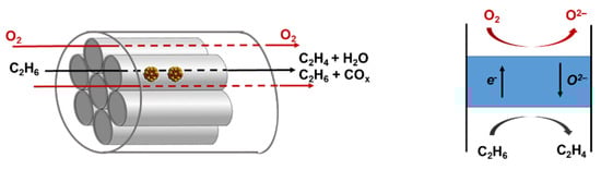 Membrane ODH is able to solve the air separation and process safety problems associated with the combined supply of feed and O2. Instead of a RedOx catalyst, a dense membrane with mixed ionic—electronic conductivity (MIEC), is used. MIEC is integrated with the catalysts to allow oxygen permeation and air separation []. The efficiency of carrying out the ODH process in a multitube membrane reactor is pretty high []. It is assumed that the inert membrane tubes are filled with catalyst particles, and oxygen is metered from the side of the housing through the membrane into the tubes, as shown in Figure 2.