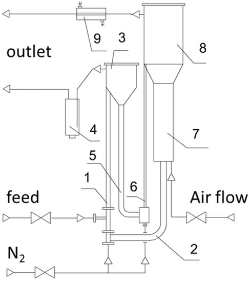 Experiments on the ODH of ethane with a circulating microspherical solid contact were carried out in a pilot setup (Figure 4) with a total catalyst load of 2 L. The catalyst had the form of a mixed oxide of composition Mo–V–O deposited in an amount of 10 wt.% on the microspherical (average fraction 70 μm) γ-Al2O3. The setup includes a reactor unit (dehydrogenation reactor), a regeneration unit (oxidation reactor), and a control unit. The feed (ethane) enters the lower part of the dehydrogenation reactor 1, where it contacts with the catalyst, which comes from the transport line 2 of the oxidation reactor. The reaction products, together with the catalyst, enter the separator of the dehydrogenation reactor 3, where they are separated, then into the dust separator 4, where the catalyst dust is deposited and then escapes into the atmosphere. The reduced catalyst enters the transport line 5, then is picked up by the nitrogen flow and rises through the pneumatic lifter 6 into the oxidation reactor 7, where it is oxidized by atmospheric oxygen. The oxidation of the catalyst takes place in a fluidized bed, which is supported by a stream of air. Then, the catalyst flows through the transport line 2 to the dehydrogenation reactor. The oxidation products, containing mainly nitrogen, are separated from the catalyst in the separator of the oxidation reactor 8 and, after cooling in the water cooler 9, go further into the atmosphere. The preparation of Mo catalysts is characterized by simplicity and complete reproducibility of their properties. The experiments were carried out at a temperature of 565–635 °C, the mass feed rate was 1.6–3.6 h−1, the duration of each experiment was 240 min, the regeneration temperature was 650 °C, oxidizing agent: raw material mass ratio was 0.45.