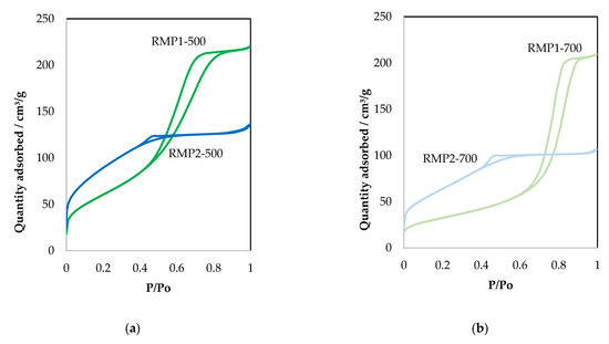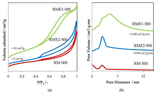 (a,b) N2 adsorption–desorption isotherms and (c,d) the corresponding pore size distribution curves of the RMP samples, shifted by 0.2 cm3/g·nm, for more clarity.