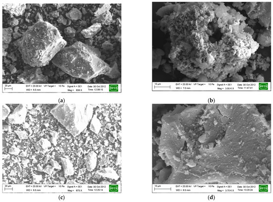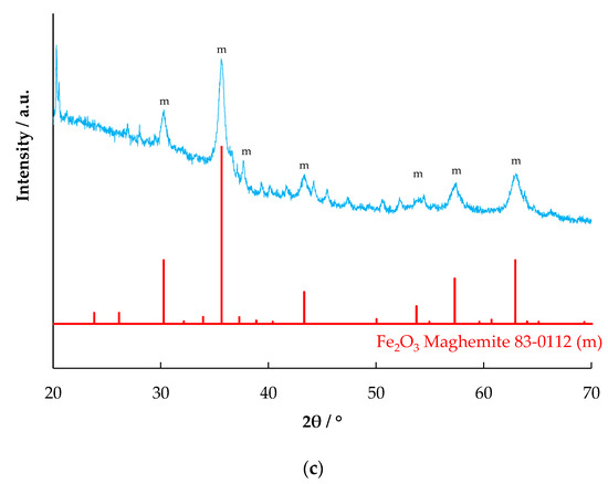 The X-ray diffraction patterns of the red mud and the evaporated samples are shown in Figure 2. The XRD pattern of the RM-500 sample (Figure 2a) matches the main combination of two standard patterns of JCPDS 89-8104 (Hematite α-Fe2O3) and JCPDS 79-1906 (Quartz SiO2). It also has peaks of JCPDS 86-2340 (Calcite, CaCO3). The XRD pattern of the RME1-500 sample (Figure 2b) matches the similar combination of the two previous standard patterns, hematite α-Fe2O3 and quartz SiO2. However, in comparison with α-Fe2O3, the proportion of SiO2 phase is significant lower, which is expected from the leaching. In addition, the sample also appears to have sodium chloride (JCPDS 5-628), which is expected from the leaching of red mud in HCl. The identified major mineral phase in the RME2-500 sample (Figure 2c) is maghemite (γ-Fe2O3) (JCPDS 83-0112). Magnetite also has similar peaks but is not likely to be present under the conditions of leaching of the red mud with oxalic acid and l-ascorbic acid, followed by evaporation and calcination at 500 °C. The presence of l-ascorbic acid reduces Fe (III) to Fe (II) and improves leaching in oxalic acid, leading to the formation of ferrous oxalate [23]. The ferrous oxalate depending on the temperature, atmosphere, and time of calcination, can form magnetite, maghemite, or haematite [24,25]; at 500 °C, magnetite forms only at low oxygen partial pressures [26]. Under the conditions of calcination carried out, haematite is expected. However, due to the presence of reducing conditions from CO arising from oxalate decomposition, maghemite could have formed. No peaks matching with aluminium compounds were observed, which could be due to their small size or amorphous nature.