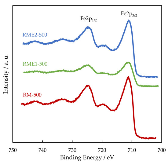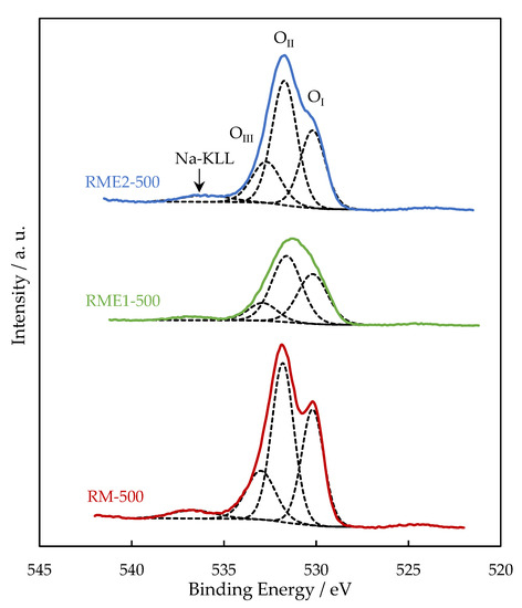 In all the samples, the Al2p and Ca2p BE values are consistent with the presence of Al3+ in Al2O3 and Ca2+ in CaCO3, respectively. Figure 3 shows the high resolution of Fe2p spectra with two prominent photopeaks associated with Fe2p3/2 (711.2 eV) and Fe2p1/2 (720 eV). Broad peaks to higher BE of the main photopeaks (718.8 eV and 733 eV) are the shake-up satellite peaks of Fe2p3/2 and Fe2p1/2, respectively, and indicates the presence of Fe2O3 (maghemite or hematite). While Al2p, Ca2p, and Fe2p BE do not significantly vary from one sample to another, Na1s BE is lowered by 0.8–1 eV for the RME2 sample. The lower Na1s BE is ascribed to the presence of sodium as sodium carbonate from the decomposition of sodium oxalate [27]. Figure 4 represents the O1s spectra of RM, RME1, and RME2 samples. The O1s signal is well described with three components. The OI at 530.0–530.2 eV is due to the presence of oxygen in transition metal oxides (titanium and iron oxides) and contributed to 45%, 48%, and 47% of total oxygen for RM-500, RME1-500, and RME2-500, respectively. The OII at 531.6–531.8 eV corresponds to oxygen in alumina and metal carbonates contributed to 33%, 36% and 30% of total oxygen for RM-500, RME1-500 and RME2-500, respectively. The OIII at 533 eV can be attributed to hydroxyl groups and its contribution was the lowest at 18%, 13%, and 18% of total oxygen for RM-500, RME1-500, and RME2-500, respectively. The low intensity photopeak observed at 536.7 eV for RM, RME1, and 536 eV for RM2 is ascribed to the Na KLL Auger peak. Owing to the Na1s BE shift previously observed, the Na KLL Auger peak is also shifted for RME2.