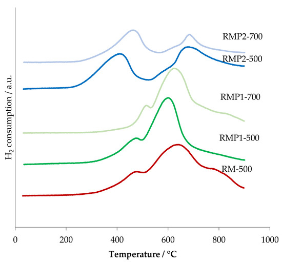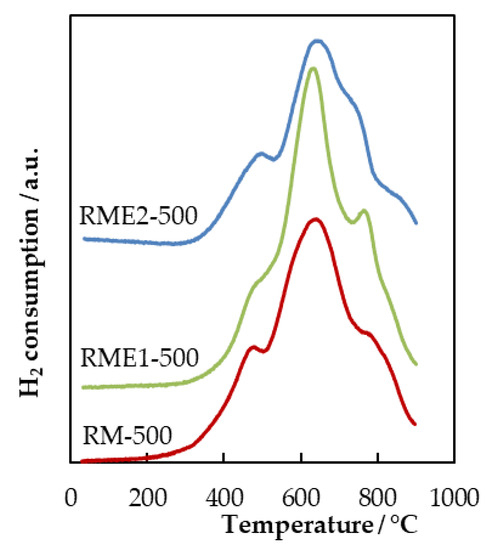 H2-TPR experiments have been performed in order to characterize the redox properties of the different samples (Figure 5). Since the oxidation of VOC over transition metal oxides takes place through a redox mechanism, a correlation between catalytic activity and H2-TPR is expected. The unmodified calcined red mud sample (RM-500) contains hematite (α-Fe2O3), which mainly contributes to the reduction profile. However, the reduction of α-Fe2O3 shows different profiles based on heating rate, moisture content, sample size etc. The red mud sample (RM-500) exhibits three overlapping reduction peaks. The first reduction peak at around 480 °C is usually ascribed to the reduction Fe2O3 to Fe3O4 while the second reduction peak at a higher temperature range (650–900 °C) is ascribed to the reduction of Fe3O4 to Fe. The number of steps involved in the reduction process of pure iron oxide has not been fully clarified. Indeed, this number is highly affected by the quantity of water in the feed [28]. Furthermore, the metastable nature of FeO and its possible disproportion to Fe3O4 and metallic iron according to the reaction 4FeO = Fe3O4 + Fe (T < 619 °C) make the reduction of FeO to metallic iron not readily observable [29].