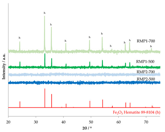 X-ray diffraction patterns of RMP samples calcined at 500 °C and 700 °C.