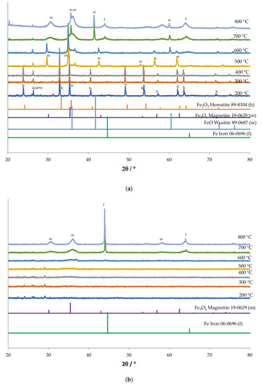 The oxalic acid precipitate sample (Figure 11b) shows an amorphous structure till about 600 °C, where peaks of magnetite appear to be forming. At 700 °C, iron peaks are also visible. At 800 °C, the peaks appear to be of magnetite and iron, showing incomplete reduction. Peaks for wustite are not seen at any temperature.