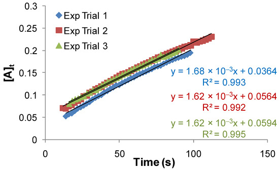 Equations (8)–(10) are the typical integrated rate equations of linear regression for first-order reaction under pseudo-first-order condition. These equations help to identify the order of reaction with respect to the reactant that is maintained at low concentration where kobs is the observed pseudo-first-order rate constant with dimension s−1. Then, the value of kobs is used to identify the order of reaction with respect to the other reactant that was maintained at excess concentration during the implementation of the pseudo-first-order condition. For a typical first-order reaction, Equation (11) is used in such circumstances.