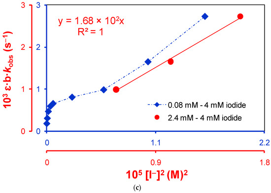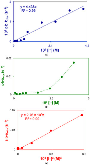 Similar to the uncatalyzed reaction, the catalyzed reaction followed zero order with respect to dicyanobis(bipyridine)iron(III) in 10–20% dioxane-water. The catalysis was observed upon the addition of 1,4-dioxane to water. The order of reaction with respect to iodide was identified to be first and third in 10% (Figure 7a) and 20% (v/v) dioxane-water (Figure 7b,c), respectively. The reaction is considered in its maximum rate while the rate of reaction depends upon the third power of a concentration term involved in the rate law. The third power dependence corresponds to the third-order reaction i.e., the maximum rate of a reaction. Our results show that in 10% dioxane-water, the reaction rate is double; i.e., it is overall first order as compared to the uncatalyzed reaction where it followed an overall fractional (0.5) order in water medium. The slope of the plot produces an overall first-order rate constant (ɛ∙b∙k) as 4.438 M−1 s−1 (Figure 7a), according to Equation (36).