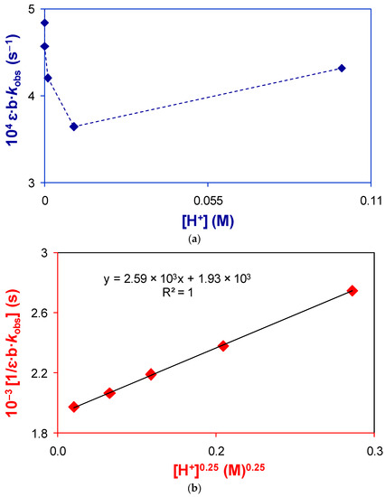 (a) Plot illustrating the rate constant as a function of rising proton concentration. (b) Inverse fractional (0.25) order plot with respect to proton (H+).