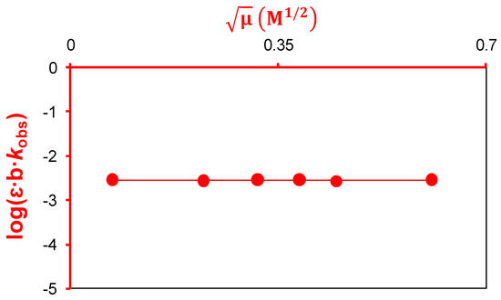 To determine the effect of ionic strength on ɛ∙b∙kobs, the time course graph was obtained at different values of the ionic strength by keeping other experimental parameters constant. The concentration of oxidant and reductant were fixed at 0.08 mM and 0.8 mM, respectively. The reaction was probed at 289 ± 0.5 K in aqueous medium, and the ionic strength was increased from 0.005 to 0.37 M by adding potassium nitrate to the reaction mixture. The graph was plotted between the log10(ɛ∙b∙kobs) (i.e., determined at each value of the ionic strength) and the square root of the value of ionic strength according to Equation (27). The results are illustrated in Figure 5. We did not observe any effect of variation in the ionic strength on the observed rate constant, which confirmed that the transition state complex was formed between monopositive dicyanobis(bipyridine)iron(III) i.e., [FeIII(bpy)2(CN)2]+, and neutral iodine (I2).