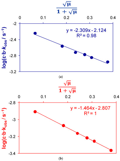 In both reaction media, the plot of log10(ɛ∙b∙kobs) versus produces a straight line with a negative slope value, confirming our hypothesis (Figure 9a,b).