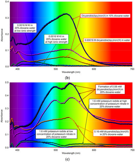 However, in 20% dioxane–water, where the reaction followed an overall third-order kinetics, the reaction attained its maximal rate by rapidly completing. According to the data (Figure 7c), the oxidation of iodide by dicyanobis(bipyridine)iron(III) reaches its highest rate in 20% binary solvent system, with an overall rate constant(ɛ∙b∙k) 2.76 × 105 M−3 s−1 according to Equation (37).