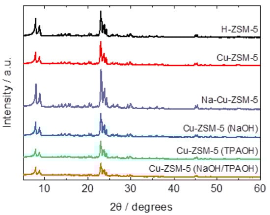 Figure 1 shows the X-ray diffraction (XRD) patterns of H-ZSM-5 and Cu-exchanged ZSM-5. Powder X-ray diffraction patterns of the samples exhibit the diffraction peaks characteristic of MFI-type materials. The zeolite structure is preserved after the post-modification of H-ZSM-5 with an aqueous solution of NaOH, TPAOH or their mixture (NaOH/TPAOH), however, lowered crystallinity of Cu-exchanged zeolite was evidenced (Table 1). This also indicates that the ion-exchange treatment with ammonium ion and/or impregnation with copper (II) ion affected the structure of ZSM-5. Only in the case of Cu-Na-ZSM-5, the crystallinity reached 131%, mainly due to the ion-exchange of H-ZSM-5 with Na (increase to 134% for Na-ZSM-5). Otherwise, we observed the decrease in crystallinity to ca. 66% of K-Cu-ZSM-5 (results not shown). Thus, the crystallinity appears to depend on the nature of the cation balancing the negative charge of the zeolite framework (H+, Na+ versus K+), and is related to the size and the location of the cation. Larger K+ ion coordinates preferably in sites on the channel intersection. The Na+ cations occupy these sites as well as the sites on top of the six-membered ring on the channel wall [].
