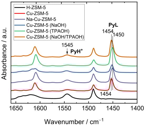 Furthermore, it is important to note that the co-cations (Na+) cannot fully replace all Brønsted acid sites (H+). Gao et al. [] correlated an efficiency for co-cations in exchanging H+ (increasing as follows: Li+ < Na+ < K+) to their effective diameters in a hydrated form. Further, the source of Brønsted acidity in Na-Cu-ZSM-5 is the hydrolysis of Cu2+ aqua complexes, i.e., [Cu(OH)]+ that provides both Cu-oxo species and H+ cations. Indeed, the share of Cu2+exch+oxo sites is the highest for Na-Cu-ZSM-5 as can be derived from quantitative IR studies of CO adsorption. The inspection into the spectra of Py interacting with surface acidic sites provides information not only on the sites‘ density. The position of PyL band contains information on both the heterogeneity and the strength of Lewis sites: the higher PyL band position is the higher strength the Lewis sites possess. Two types of Lewis acid sites, related to copper sites of different electron acceptor properties, are populated in the studied samples (Figure 4), as identified by 1454 and 1450 cm−1 PyL bands. Most electron-acceptor sites are accommodated in Cu-ZSM-5 and both alkali treatment and modification with Na+ ions result in their strength lowering. Judging from the variety of copper forms that can serve as Lewis acid sites it is impossible to determine the concentration of Na+ and Cu+ independently from each other.