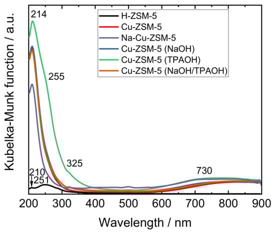 Figure 5 shows the ultraviolet-visible diffuse reflectance spectra (DR UV-Vis) of the studied samples (calcined at 500 °C, 4 h, air). The adsorption bands at about 210 and 251 nm are present over pure H-ZSM-5, and these bands can be assigned to the zeolite structure (band-originating from the charge transfer O2-Al3+ and surface defects, respectively) [,]. For all Cu-containing materials two distinct bands in DR UV-Vis spectra appeared. The charge transfer band at around 211–214 nm is related to O → Cu charge transition (CT) from lattice oxygen to isolated Cu+/Cu2+ species stabilized by the zeolite framework [,]. The broad absorption band between 550 and 900 nm is assigned to the d-d transitions of Cu2+ ions in pseudo-octahedral coordination (e.g., Cu(H2O)62+) [,]. Additional bands at around 255 nm (especially visible in the spectra recorded for Cu-ZSM-5 (TPAOH)) and 325 nm, were attributed to CuO species and the oligomeric [Cu–O–Cu]2+ chains []. Cu-ZSM-5 (TPAOH) possesses higher amount of copper content (3.3. wt %) compared to the other materials, i.e., Cu-ZSM-5 (NaOH) and Cu-ZSM-5 (NaOH/TPAOH) with the copper content of 2.7 wt %. The DR UV-Vis data also support the FT-IR results that allow us to conclude on the presence of a high concentration of isolated Cu+ and Cu2+ ions and a high content of oxide species in Cu-ZSM-5 (TPAOH). The DR UV-Vis spectrum for material modified with Na+ as co-cation and further with copper ions don’t show any new bands (as indicated above). Interestingly, Na-Cu-ZSM-5 revealed a higher content of copper (4.2 wt %, based on ICP-OES analysis, Table 1) compared to Cu-ZSM-5 (TPAOH), thus a higher contribution of aggregated copper species can be expected. The small half-width of 214 nm band in Na-Cu-ZSM-5 suggests the homogeneity of Cu+/Cu2+ species engaged into interaction with zeolite framework. Further, its lower intensity among all materials tested indicates that Na+ ions replaced copper cations in exchange positions forcing the copper to form oxo-species. As can be seen from the spectrum for this material (300–600 nm), the presence of co-cation promoted the evolution of [Cu–O–Cu]2+ dimers (ca. 325 nm). Further temperature-programmed measurements (TPD-NOx) were carried out to prove promoted the development of copper-oxo-species.