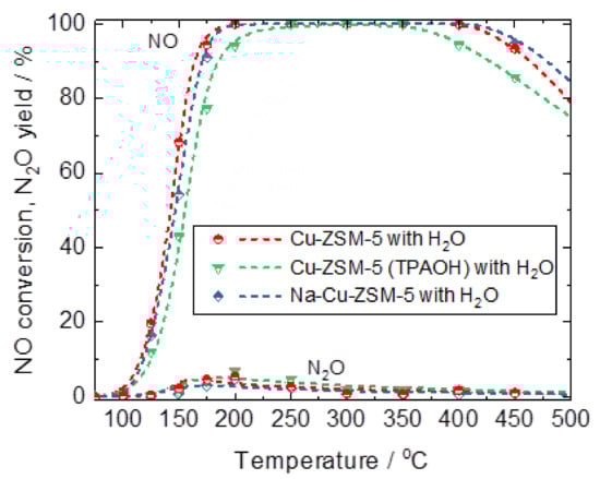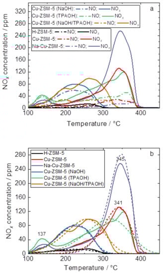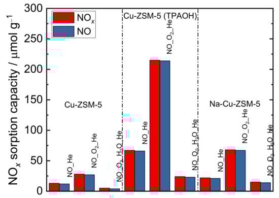 Furthermore, the effect of a mixture of NO/He, NO/O2/He and NO/O2/H2O/He on the adsorption of NO was studied by carrying out NO adsorption and TPD tests on Cu-ZSM-5, Cu-ZSM-5 (TPAOH) and Na-Cu-ZSM-5 to quantitatively determine the species affected by O2 and H2O up to 450 °C (Figure 7). The oxidation of NO to NO2 did not appear on the lattice oxygen of Cu-exchanged ZSM-5, pronounced by the same adsorption capacity. The presence of O2 in the feed mixture enhanced NO adsorption, especially in the case of Cu-ZSM-5(TPAOH) and Na-Cu-ZSM-5, thus the materials containing aggregated copper oxides. Additionally, the presence of H2O strongly reduced NO adsorption by its displacement from copper sites, as reported by Landi et al. []. However, the reduction of NOx adsorption by water could not be the main factor influencing the catalytic results (see Section 2.3. Catalytic and Spectroscopic Investigations—NH3-SCR).