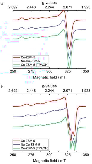 To summarize, the main difference between the samples can be attributed to the quantity of monomeric Cu2+ ions detected in the hydrated state: the amount of EPR active Cu species in Cu-ZSM-5 sample (relative intensity 0.14) is seven times lower with respect to the Na-Cu-ZSM-5 sample (relative intensity 1.00) confirming the higher ion-exchange capabilities when co-cation is already accommodated.