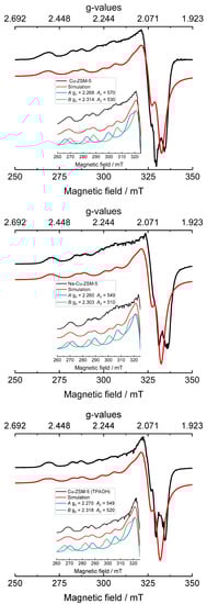 The EPR spectra were recorded at −196 °C with a Bruker ESP 300E spectrometer operating at a microwave frequency 9.5 GHz. The modulation amplitude and the microwave power were kept at 5 G and 2 mW, respectively. The spectra were simulated by using the Easyspin software (version 6.0.0-dev.26, University of Washington, Seattle, WA, USA) []. An axial spin Hamiltonian model was used for the simulation of each spectrum with a Lorentzian line shape and an equal line width for all the species. The dehydrated samples were obtained by placing about 3–20 mg of Cu-ZSM-5 into a 4 mm cell tube connected to a vacuum line and dehydrated under dynamic vacuum at 200 °C for 1 h, reaching a final pressure of 10−3 mbar.
