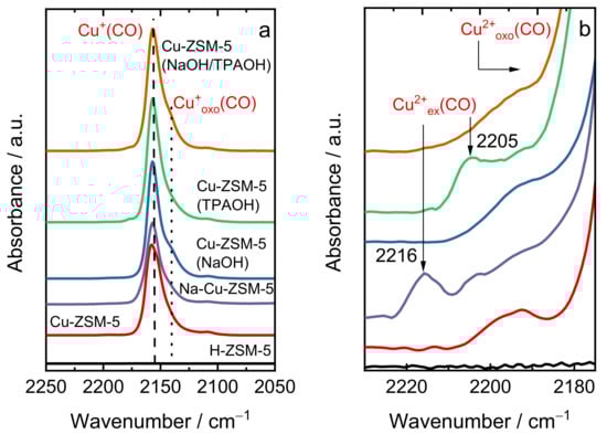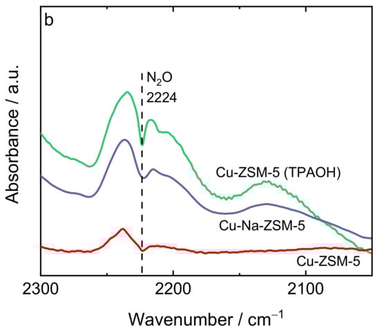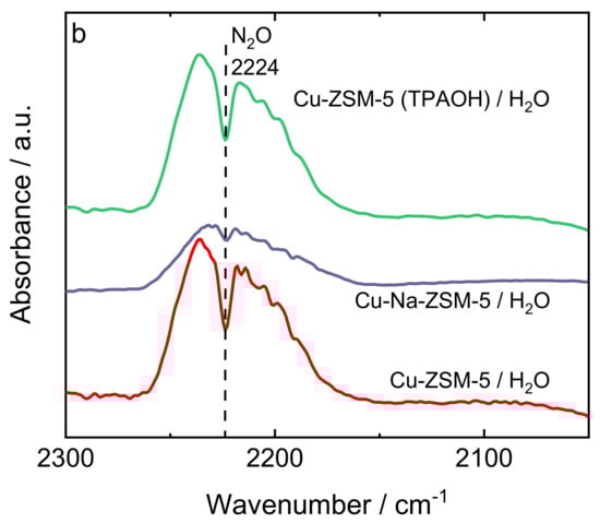 In order to delve more clearly into the nature of copper centers, the studies of low-temperature CO adsorption were carried out. The CO molecule is very sensitive to copper oxidation state thus the position of the C≡O bond vibration allows to conclude on both the presence of Cu+ and Cu2+ cations and their agglomeration if their bear the form of the oxides. Figure 10a presents the spectra of CO adsorbed at room temperature (RT) on Cu-exchanged ZSM-5 as an example. At room temperature the interaction of CO with copper sites in zeolite results in the appearance of a strong band at 2157 cm−1 of Cu+(CO) and a much weaker band at 2141 cm−1 of Cu+oxo(CO). The Cu2+oxo(CO) and Cu2+exch(CO) monocarbonyls (denoted herein Cu2+exch+oxo(CO)) are found at 2210–2200 cm−1 frequency range if the CO adsorption is performed at temperatures as low as −100 °C (Figure 10b). On the basis of the intensities of the monocarbonyl bands, i.e., (Cu+exch(CO), (Cu+oxo(CO), and Cu2+exch+oxo (CO) and the values of the absorption coefficient of the respective monocarbonyl bands [] the concentrations of copper sites was calculated (Table 6). While the relative variations in the concentration of Cu+ cations do not exceed 20% the variations in copper sites concentrations that are observed for Cu2+exch+oxo and Cu+oxo species are significantly more important. Na-Cu-ZSM-5 and Cu-ZSM-5 (TPAOH) accommodate the highest number of oxo-species easily accessible for CO molecules (thus for NH3-SCR reactants due to similar kinetic diameter), further the amount of copper (II) oxo-species is the highest among all the studied materials. In Cu-ZSM-5, Cu-ZSM-5 (TPAOH/NaOH) and Cu-ZSM-5 (NaOH), the population of copper ions that in the exchange positions is similar to the Cu+ and Cu2+ in oxide forms. Considering the Cu-exchanged ZSM-5 containing co-cation, it is visible that the presence of Na+ results in the increased formation of Cu+. Additionally, Sultana et al. [] elucidated the influence of Na+ co-cation on the appearance of Cu+ species in Cu-ZSM-5. They found that the concentration of Cu+ species increased with an increase in the residual sodium content from 0.04 to 0.3 wt %. The variety of copper (II) monocarbonyls appeared due to the interaction of the probe with copper (II) sites of various electron-acceptor properties (2220–2190 cm−1). The bands of the highest frequencies are found for the Na-Cu-ZSM-5 (2216 cm−1) and Cu-ZSM-5 (TPAOH) (2205 cm−1) materials what allows concluding on the highest electron-acceptor properties of copper (II) centers that they accommodate. The co-presence of Na+ cations significantly affects the sites in Cu-ZSM-5; they are undoubtedly more electron-acceptor than in Cu-ZSM-5 (TPAOH) what finally can facilitated binding reagent molecules.
