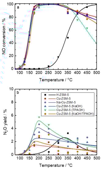 Results of catalytic studies: NO conversion and N2O yield (reaction conditions: 0.2 g of catalyst, 120 mL min−1, 500 ppm NO, 575 ppm NH3, 4 vol.% O2, 5 vol.% H2O and He balance, GHSV = 30,000 h−1).
