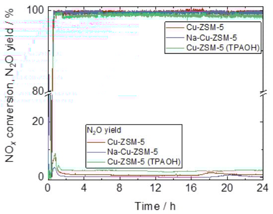 NO conversion and N2O yield during NH3-SCR over the Cu-exchanged ZSM-5 (reaction conditions: 0.2 g of catalyst, 120 mL min−1, 500 ppm NO, 575 ppm NH3, 4 Vol.% O2, 5 Vol.% H2O, and He balance, GHSV = 30,000 h−1, 350 °C, 24 h).