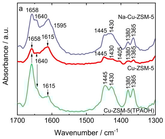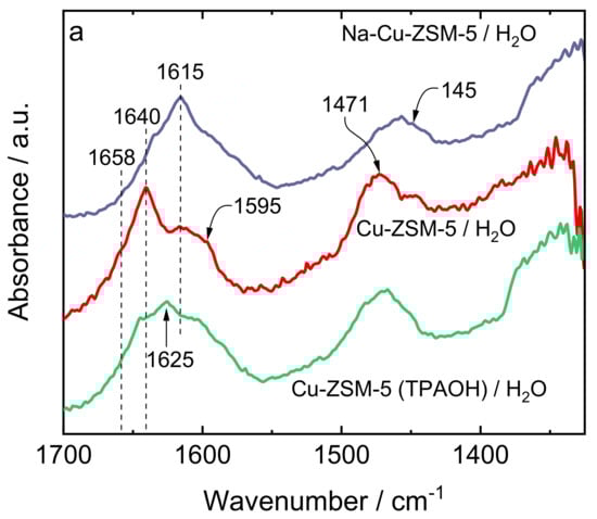 The most important adsorption adducts and reaction intermediates can be easily identified in the FT-IR spectrum. The reagents (NO, O2 and NH3) in the stoichiometric amounts (c(NO)/c(O2)/c(NH3) = 4:1:4) were contacted with the catalysts-Cu-ZSM-5, Na-Cu-ZSM-5 and Cu-ZSM-5 (TPAOH) at 150 °C for 10 min then the FT-IR spectrum was collected (Figure 14). In the spectrum of reagents adsorbed on the studied materials the most intensive bands came from the species identified by the 1658–1640 cm−1 bands assigned to NO3− species. This indicates that NO can be easily oxidized to the surface nitrates upon contact with O2 already at 150 °C. The position of these bands strongly depends on the NO3− structure (speciation into monodentate, bidentate, or bridged entities), and on the kind of the cation to which they are bonded. The bands in the region of 1658–1640 cm−1 can also be considered as originating from ammonia molecules coordinatively bonded to Lewis acid sites, e.g., copper/sodium cations. The 1445–1430 cm−1 bands can originate from ammonium ions NH4+ appeared as the most characteristic moiety attributed to the reaction of ammonia with Brønsted sites (strongly acidic Si(OH)Al groups). On the other hand, the huge intensity of 1658–1640 cm−1 bands also justifies the attribution of the 1445–1430 cm−1 bands to monodentate nitrate species—the intermediate products of NH3-SCR. The presence of NO2− is also manifested by the modes below 1400 cm−1. The formation of NO3− is accompanied by the evolution of water (1615 cm−1) because the nitrate anions replace surface OH groups. The water molecules are also the final reaction product of NH3-SCR. The H2O formation does not hinder the formation of nitrates. The significant intensities of nitrate species in Cu-ZSM-5 (TPAOH) signify that these intermediates are easily accumulated on the catalysts surface, their decomposition is not as effective as for Cu-ZSM-5 or even in Na-Cu-ZSM-5. The stability of nitrate species in Cu-ZSM-5 (TPAOH) and Na-Cu-ZSM-5 is supported by the formulation of N2O in these materials in significant amounts. Therefore, the high concentration of Cu2+oxo species (IR studies, Figure 10, Table 6) of low dispersion facilitates the production of N2O by stabilizing nitrate intermediates on the catalyst surface. The presence of water in the feed (5 vol.%) inhibits the decomposition of NO3/NO2− and NH4+ species. Their amount on the catalysts surface is nearly 3-fold higher than in water-free conditions. The accumulation of the intermediate moieties is accompanied by the higher production of N2O (Figure 15b). This effect is most pronounced for Cu-ZSM-5.