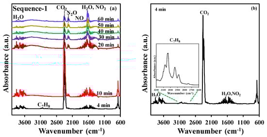 After the adsorption step, the NTP exposure step has been performed in dry air (0.2 L·min−1) at a discharge power of 46 W using a time span of 60 min. During NTP exposure, toluene, CO2, N2O, NO2, NO, and H2O are the only gaseous species detected at the outlet of the reactor by FT-IR, as shown in Figure 2. This work will only focus on the quantification of the desired end product (CO2) as the quantification of H2O, NO2, and N2O was not possible as the instrument was not calibrated for these species. Figure 2b represents an enlargement of the FT-IR spectrum (4 min of NTP exposure) of the effluent from the DBD reactor, which revealed the desorption of toluene at the beginning of the NTP discharge stage. To summarize, during the discharge stage, in addition to the desorption of reversibly adsorbed toluene molecules, an eventual break down of irreversibly adsorbed toluene into CO2 and H2O is observed. Interestingly, the formation of NOx species appears only after approx. 10 min of reaction and is observed continuously after 20 min. Thus, no or little NOx is produced during the CO2 production supposedly because the oxidation active sites are occupied by adsorbed toluene. Once toluene is fully converted, these sites become active for N2 oxidation. This feature opens the path for a significant reduction of NOx production by adjusting the NTP discharge time to the minimum required for the combustion of adsorbed toluene and the regeneration of the catalyst.