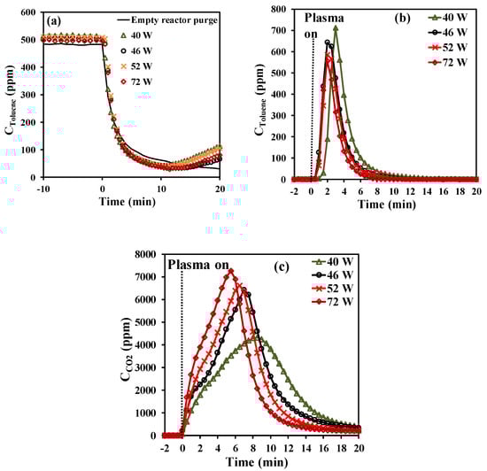 The effect of the adsorption time reveals that short adsorption periods favor the efficiency of the abatement process in terms of selectivity and yield towards complete oxidation of toluene, while longer adsorption periods are more favorable in terms of energy cost and efficiency. Therefore, for the further study over Hopcalite in this sequential abatement of toluene, a fixed adsorption time of 20 min has been chosen. The effect of the applied discharge power on the temporal evolution of toluene and CO2 during the NTP exposure has been investigated considering a storage time span (t1) of 20 min followed by an NTP discharge time (t2) of 60 min with an increased applied discharge power (40, 46, 52, and 72 W corresponding to a voltage amplitude of 6.5, 7.0, 7.5, and 8.0 kV, respectively), all other parameters being similar as before. It is noticed for all experiments that the temporal toluene profiles as shown in Figure 3a during the storage stage are quite similar to the temporal evolution of the amount of toluene adsorbed within the margin of error. Based on these temporal toluene profiles, the total amount of toluene adsorbed on the Hopcalite packed bed was determined and the results are presented in Table 3. The obtained qads values remain quite constant (43.8–45.4 µmol·g−1) as can be seen in Table 3. This can be attributed to the good efficiency of the NTP exposure for Hopcalite regeneration allowing to get at the start of each experiment a quasi-similar material.
