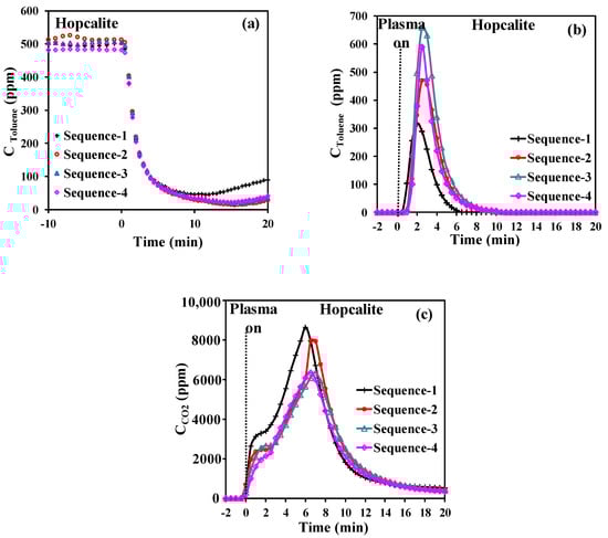 Temporal profiles of toluene during adsorption (a), desorbed toluene during NTP exposure (b), CO2 evolution during NTP exposure, (c) over the 4 sequences.