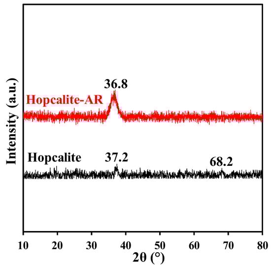The X-ray diffraction patterns of Hopcalite before and after a multi-sequential APC process (after 15 NTP exposures) are shown in Figure 5. Two low intense peaks localized at 37.2° and 68.2° in 2θ are shown for fresh Hopcalite indicating the presence of a mostly amorphous MnOx phase [29,30,31]. The peak at the higher 2θ angle is still present in the XRD profile after performing the multi-sequential APC process, but shifts to a lower 2θ angle, while also becoming more intense and broader. The broadening of the peak indicates that the material possesses a poor crystallinity after the APC process performed with multiple sequences.