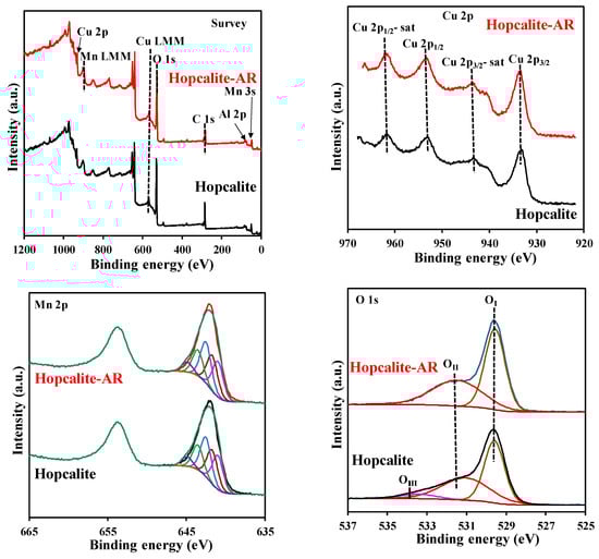 XPS survey spectra and high resolution Cu 2p, Mn 2p, and O 1s spectra of Hopcalite and Hopcalite-AR.