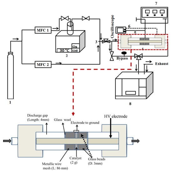 The experimental set-up given in Figure 9 was decomposed into three main components: (i) flue gas preparation, (ii) adsorption and non-thermal plasma reactor, and (iii) gas analysis. The initial toluene concentration C0 (Toluol ≥ 99.5%, Carl Roth) in dry air (Alphagaz 1, Air Liquide) and the total gas flow rate were maintained at 500 ± 10 ppm and 0.2 L·min−1, respectively, using mass flow controllers (MFC, El-flow®, Bronkhorst). The adsorption and subsequent plasma oxidation experiments were conducted at room temperature and atmospheric pressure. The description of the PBDBD (packed bed dielectric barrier discharge; AC power supply of 50 kHz) reactor was previously given [37]. The reactor was filled with 2 g of Hopcalite trapped between two layers of borosilicate glass beads (Sigma Aldrich, 3 mm diameter). The power injected in the plasma reactor was calculated by integrating the instantaneous voltage and current waveforms averaged over four cycles. The gaseous products were analyzed using a Fourier-transform infrared (FT-IR) spectrometer (Bruker, Tensor 27). The FT-IR is equipped with a DTGS (deuterated triglycine sulfate) detector and a gas cell with a 20 cm optical path length with ZnSe windows. After reaching steady state conditions, the FT-IR spectra averaged over 20 different samples are obtained with a resolution of 4 cm−1 and an aperture of 6 mm. OPUS (Bruker) software is used to collect and analyze the obtained spectra.