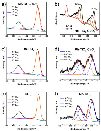 XPS spectra of (a,c,e) Ti 2p, (b) Ce 3d, and (d,f) Rh 3d for different photocatalysts.