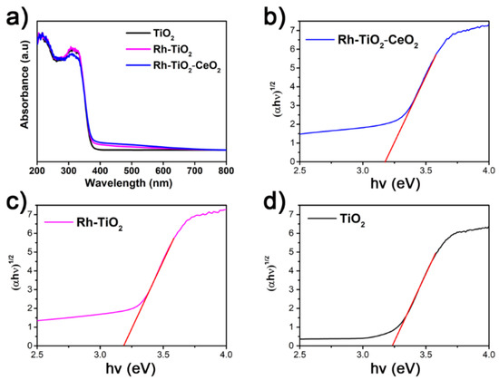 UV–Vis DRS of (a) Rh–TiO2–CeO2 hybrid, Rh–TiO2 hybrid, and TiO2 photocatalysts and corresponding plots of the (αhν)0.5 versus photon energy (hν) for (b) Rh–TiO2–CeO2 hybrid, (c) Rh–TiO2 hybrid, and (d) TiO2 photocatalysts.