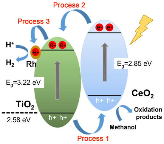 The schematic diagram of photocatalytic hydrogen production over Rh–TiO2–CeO2 hybrid photocatalysts under irradiation.