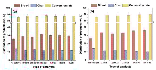 Influence of catalyst type on distribution of hydrothermal liquefaction products: (a) homogeneous catalysis, (b) heterogeneous catalysis.