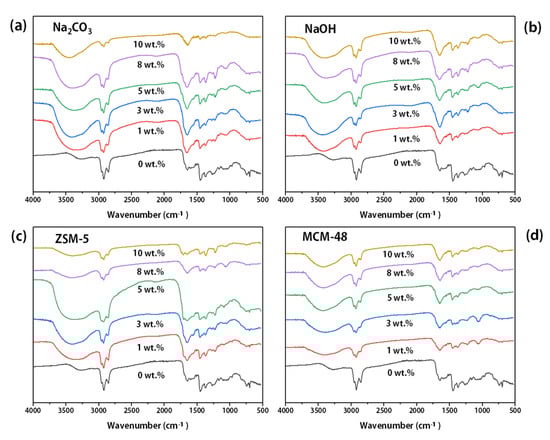 Effect of the catalyst dosage on the functional groups in bio-oil: (a) Na2CO3, (b) NaOH, (c) ZSM-5, (d) MCM-48.