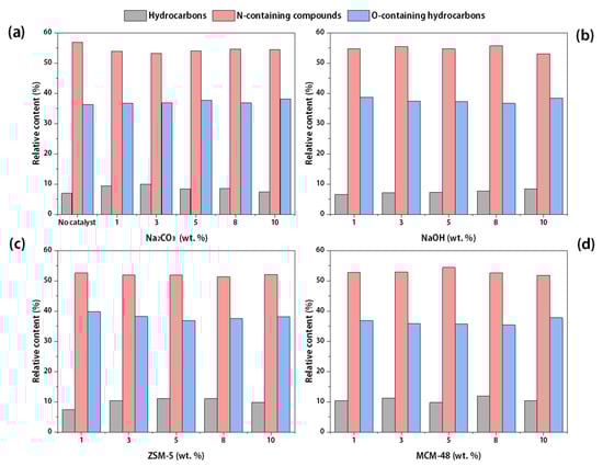 After catalytic hydrothermal treatment, the main components of bio-oil were oxygen-containing hydrocarbons and nitrogen-containing compounds, as well as a small amount of hydrocarbons, as shown in Figure 3. Compared with non-catalytic conditions, catalytic hydrothermal liquefaction significantly increased the content of hydrocarbons and oxygen-containing hydrocarbons whilst reducing the content of nitrogen-containing compounds.