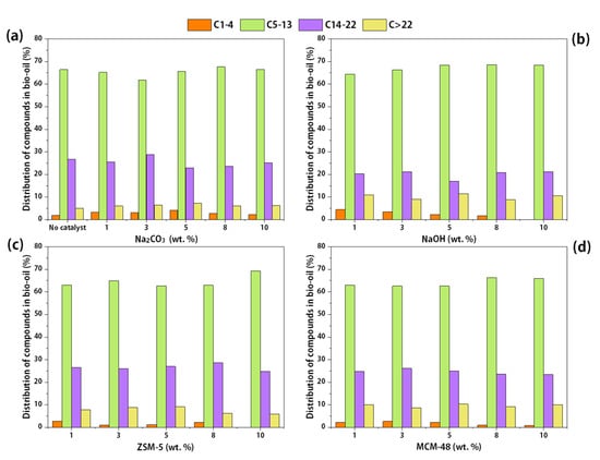 The carbon chain distribution of compounds in bio-oil under catalytic and non-catalytic conditions is shown in Figure 4. The content of C1-4 components in non-catalytic bio-oil was 1.94%. Homogeneous catalysts increased the content of C1-4. When the addition of Na2CO3 and NaOH was 5% and 1%, the C1-4 content increased to 4.15% and 4.46%, respectively. When heterogeneous catalysts were employed, the content of C1-4 remained at a low level. C5-13 and C14-C22 accounted for the majority of total compounds in bio-oil, which also represented the length range of the carbon chain for gasoline and diesel. The content of C5-13 increased with the increase in the catalyst dosage, which could be mainly caused by the decomposition of the C14-C22 and >C22 components.