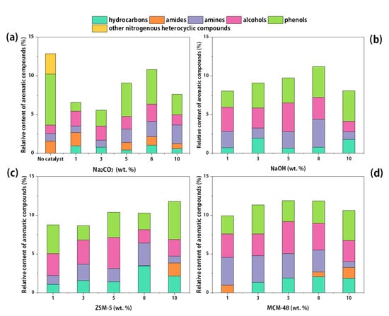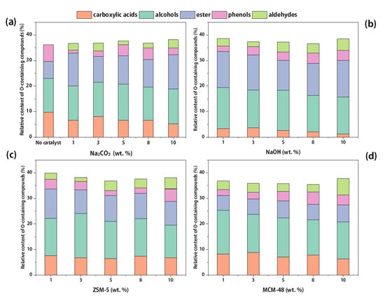 The oxygen-containing hydrocarbons found in bio-oil are mainly carboxylic acid, alcohol, lipid, phenol and aldehyde, as shown in Figure 7 and Tables S1–S3. In general, catalytic hydrothermal treatment increased the proportion of oxygen-containing hydrocarbons. The content of oxygen-containing compounds was 36.21% under non-catalytic conditions. After the addition of catalysts, the proportion of oxygen-containing components in bio-oil increased to 36.7–38.15% (Na2CO3), 36.62–38.66% (NaOH), 36.89–39.86% (ZSM-5) and 35.45–37.80% (MCM-48).