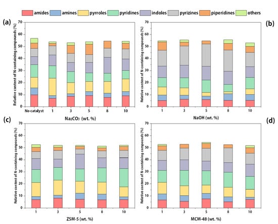 Nitrogen-containing compound distribution of PR bio-oil: (a) Na2CO3, (b) NaOH, (c) ZSM-5, (d) MCM-48.